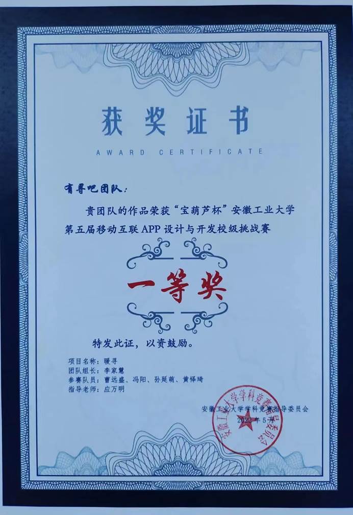 6、获校2022年“宝葫芦杯”校第五届移动互联APP设计与开发校级挑战赛一等奖;