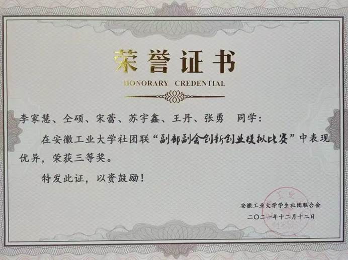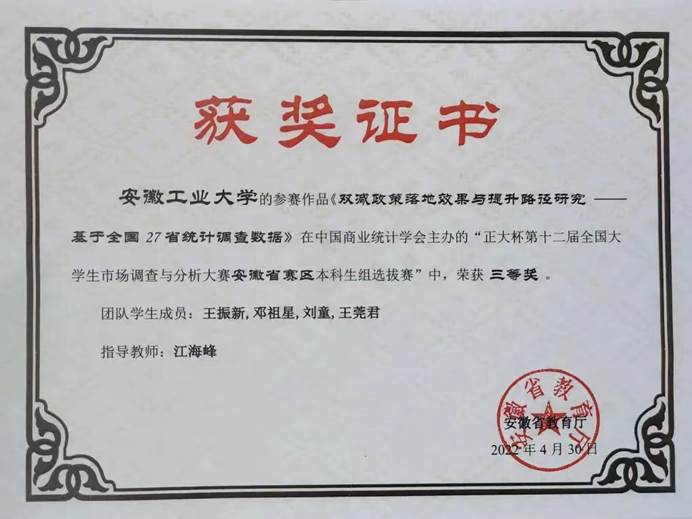 2、获2022年正大杯第十二届全国大学生市场调查与分析大赛安徽省赛区本科生组选拔赛三等奖;